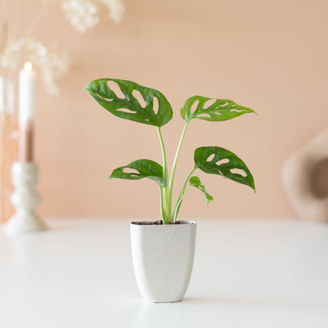 Here I am! Your very own baby Swiss cheese plant. I hope you’re willing to take good care of me. Put me in a bright spot indoors and give me a little water every other day.